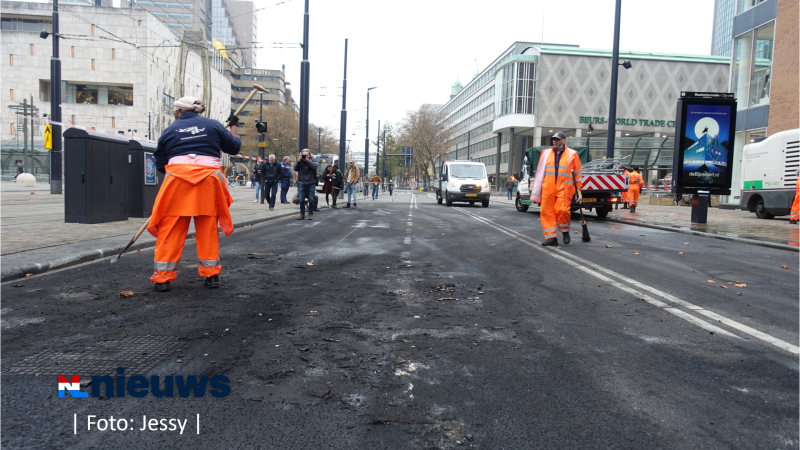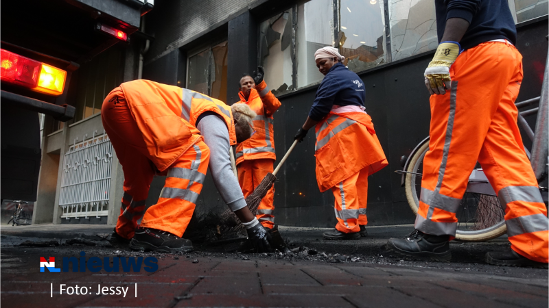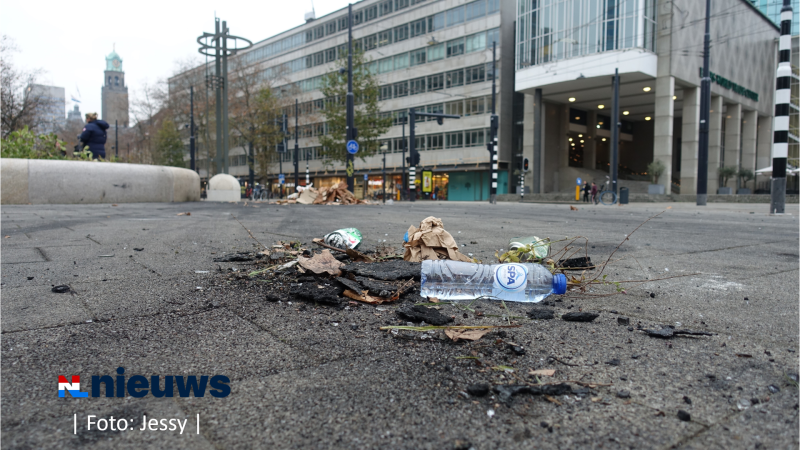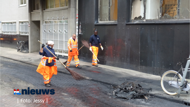 Een dag na de rellen in het centrum van Rotterdam heeft de gemeente hun handen vol om alles op te ruimen. Er is veel schade en rommel.