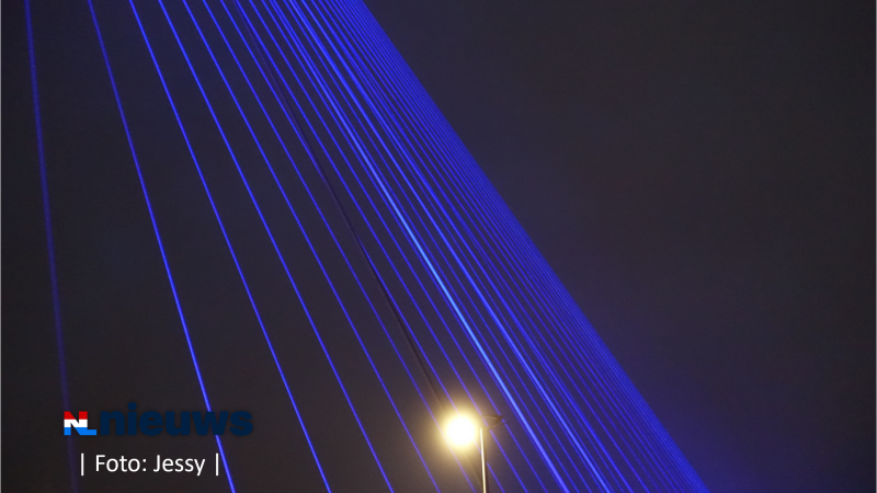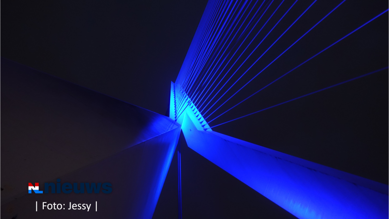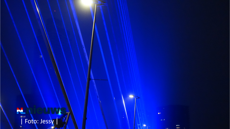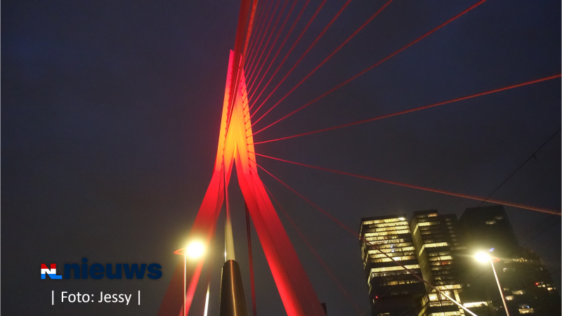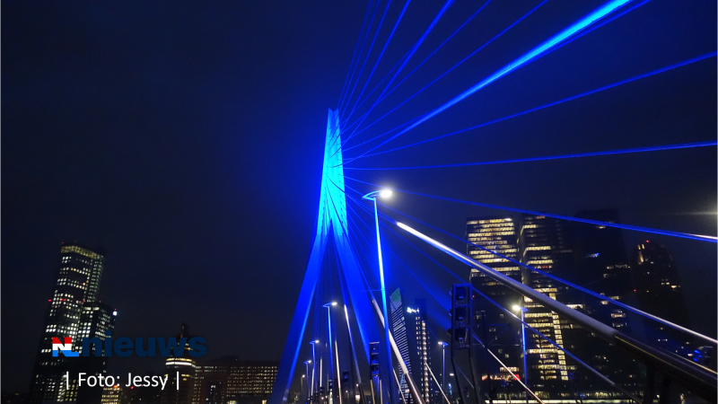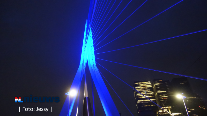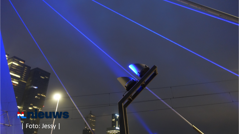 De Erasmusbrug en de Hofpleinfontein in Rotterdam kleurde vanaf dinsdagavond rood en blauw. De verlichting is een eerbetoon aan de hulpverleners die afgelopen vrijdagavond in de stad optraden tijdens de rellen.