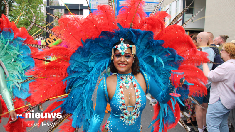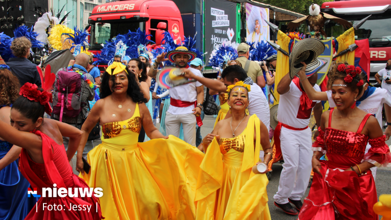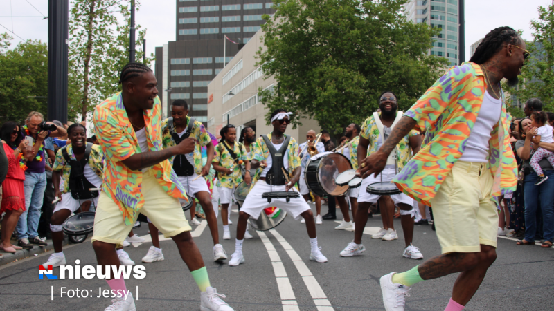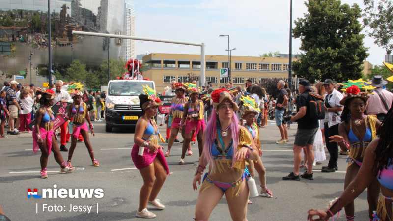 Een kleurrijke stoet van dansers, danseressen, muzikanten en praalwagens trok door het centrum van Rotterdam als onderdeel van het Zomercarnaval.