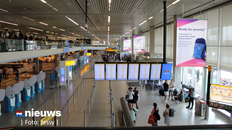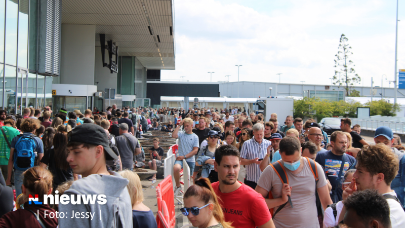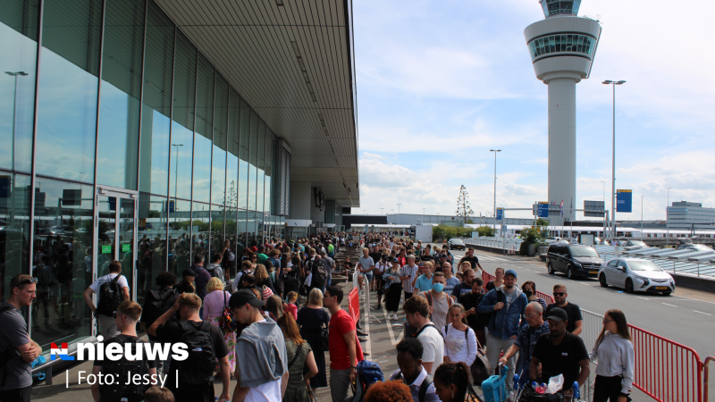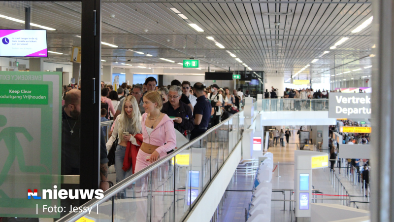 Schiphol heeft opnieuw te maken met topdrukte. Tot ver buiten de aankomst- en vertrekhallen staan rijen met passagiers. Een aantal reizigers heeft ook de vlucht gemist door lange wachttijden voor de security.